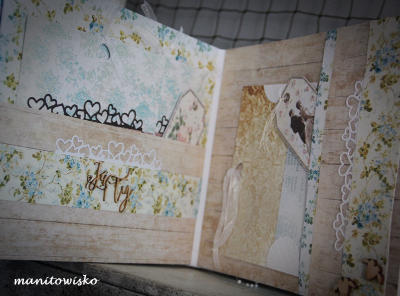 Jakiś czas temu moja koleżanka poprosiła mnie o zrobienie czegoś w rodzaju pamiątki na ślub siostry. Nie było wytycznych co do formy pamiątki ani kolorystyki, była tylko jedna prośba, ale za to jaka. Ponieważ młodzi są policjantami- potrzebne były nawiązania do tego tematu. Hmmm. I co tu począć. Postanowiłam, że zrobię album, to raz. Wykorzystam sporo koloru niebieskiego, to dwa- a trzy- to w album wmontuję jakieś niewielkie elementy kojarzące się ze służbą. Padło na tekturki w formie czapki i kajdanek, bo one kojarzyły mi się ze ślubnym tematem idealnie ;), no co? Do tego dużo romantycznych klimatów- kwiaty, kwiaty, kwiaty, serca, zakochańce. To największy w formie album jaki do tej pory zrobiłam i powstał, jak to u mnie, od zera przy wykorzystaniu moich rąk- od stworzenia bazy do zawiązania ostatniej wstążki.